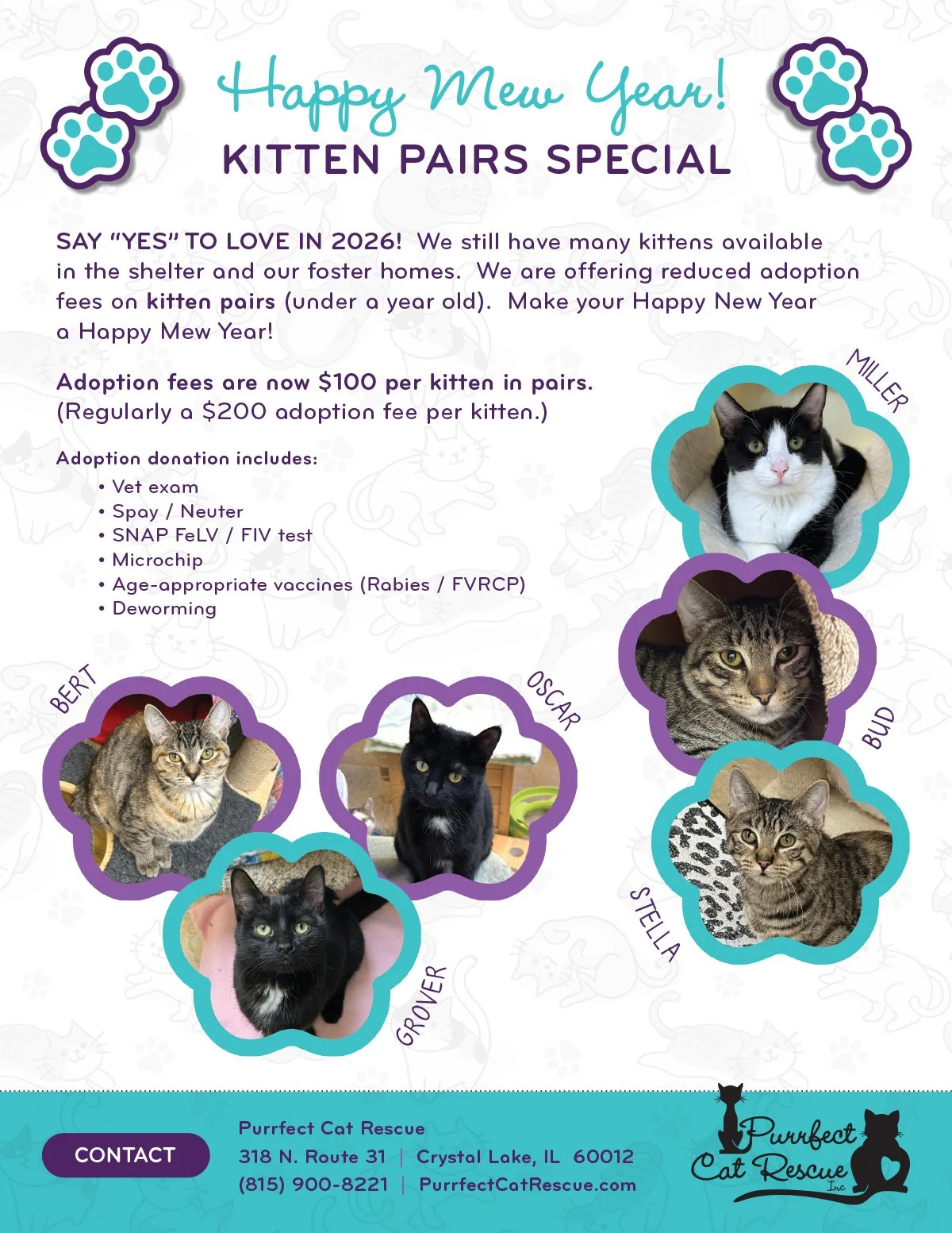 Skip cooking dinner and leave it to Raising Cane’s! Join us for a Chow & Meow fundraiser event at Raising Cane’s in Crystal Lake on Wednesday, February 18. 15% of the net sales will go to help the cats of Purrfect Cat Rescue. Show the flyer or mention at the register when ordering. (If ordering online or through the App, use code RCFUND96 at checkout.) If you do not mention Purrfect Cat Rescue or show the flyer, we will not get credit for the sale and lose out on the donation.