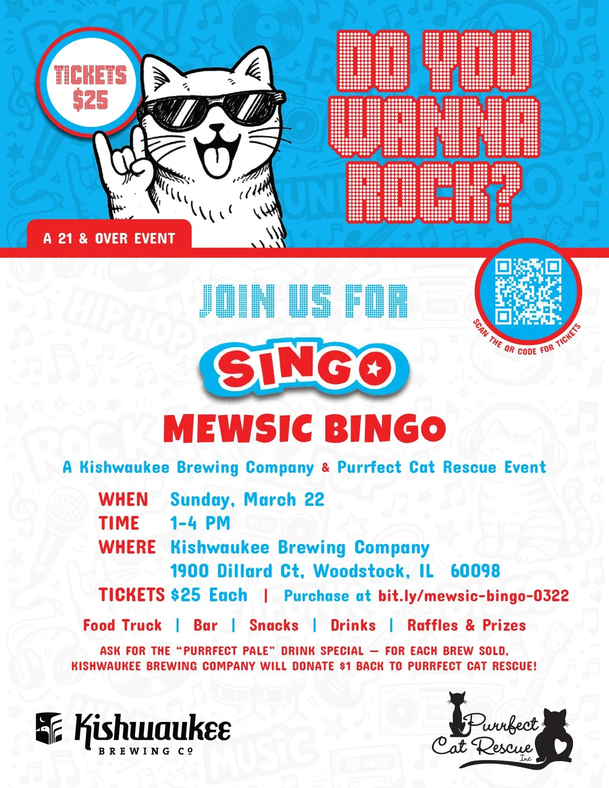 Purrfect Cat Rescue is pairing up with Kishwaukee Brewing Company in Woodstock for a SINGO Mewsic BINGO fundraiser! Join us for raffles and prizes, snacks, drinks, and tons of fun. The bar will be open and there will be a food truck available.