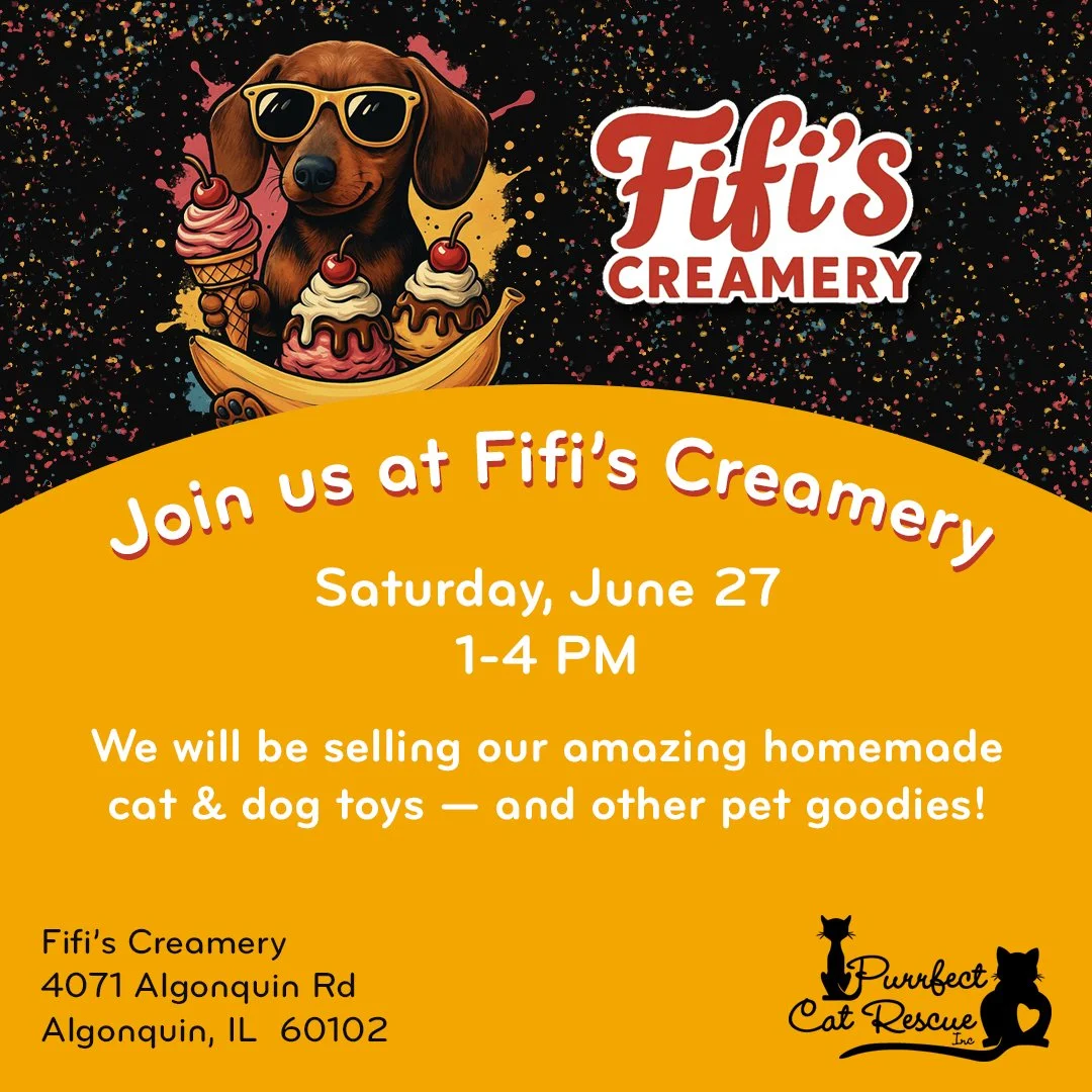 Join us for a fundraiser event at Fifi’s Creamery on Saturday, June 27 and grab a sweet treat for yourself — and a fun toy for your fluffy best friend! We will be selling our amazing homemade cat and dog toys, and other pet goodies!