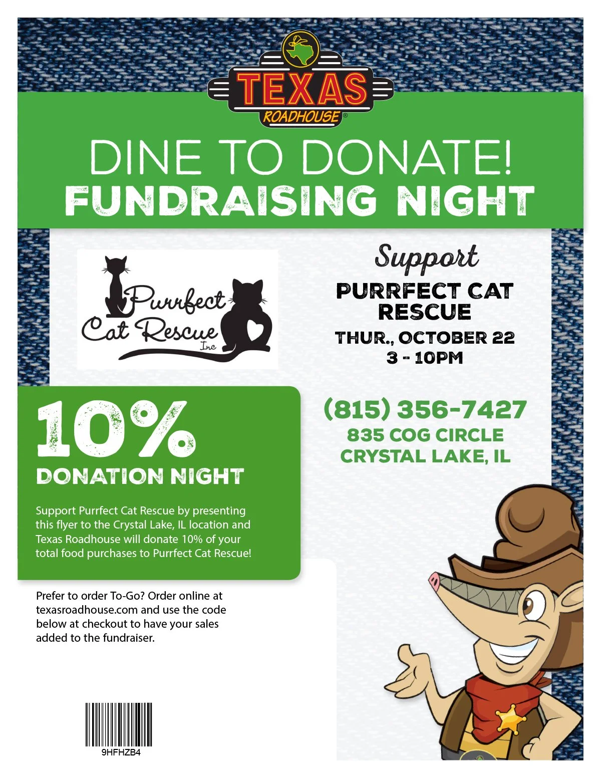 Skip cooking dinner and leave it to Texas Roadhouse! Join us for a Chow & Meow fundraiser event at Texas Roadhouse in Crystal Lake on Thursday, October 22.