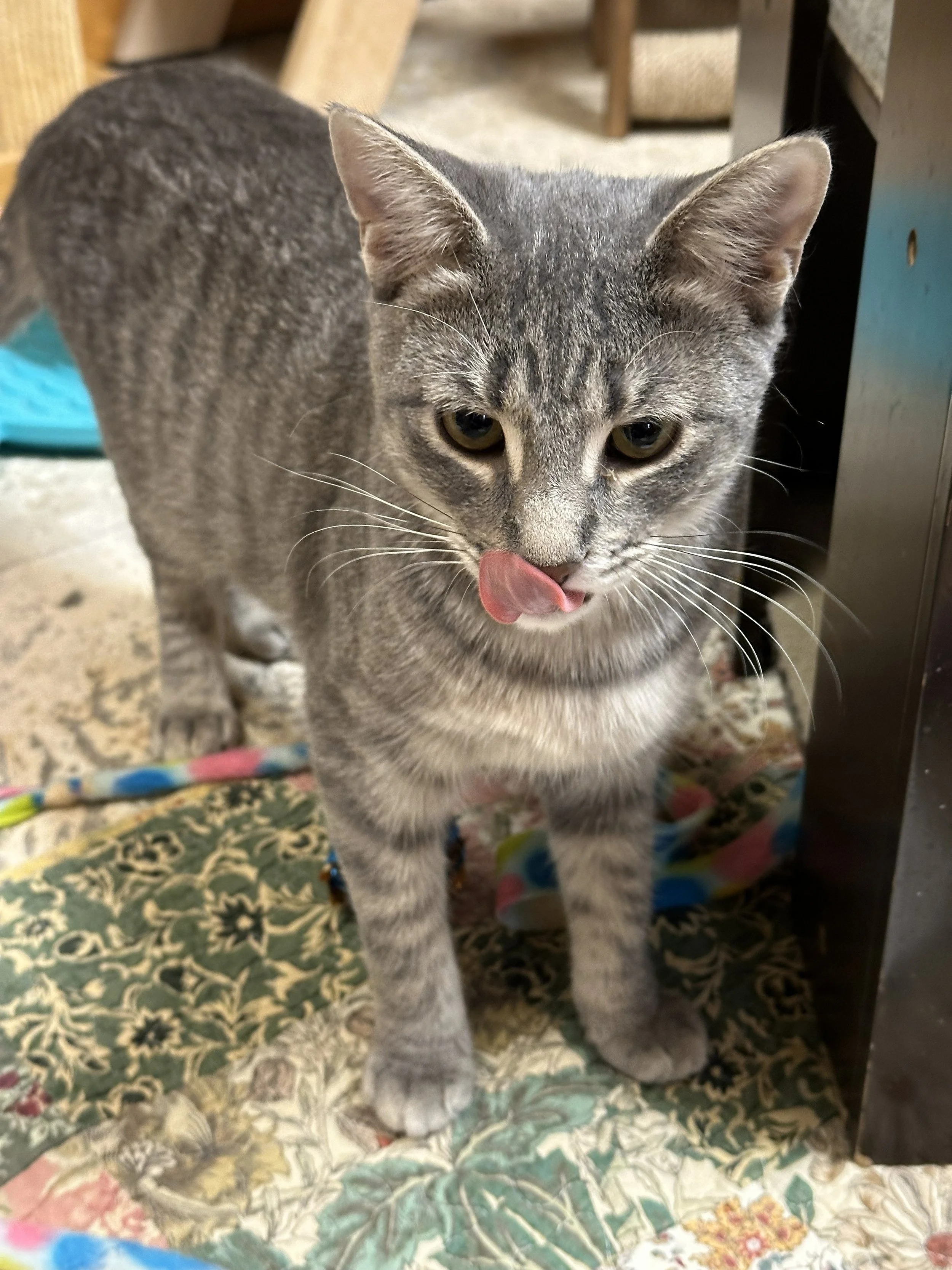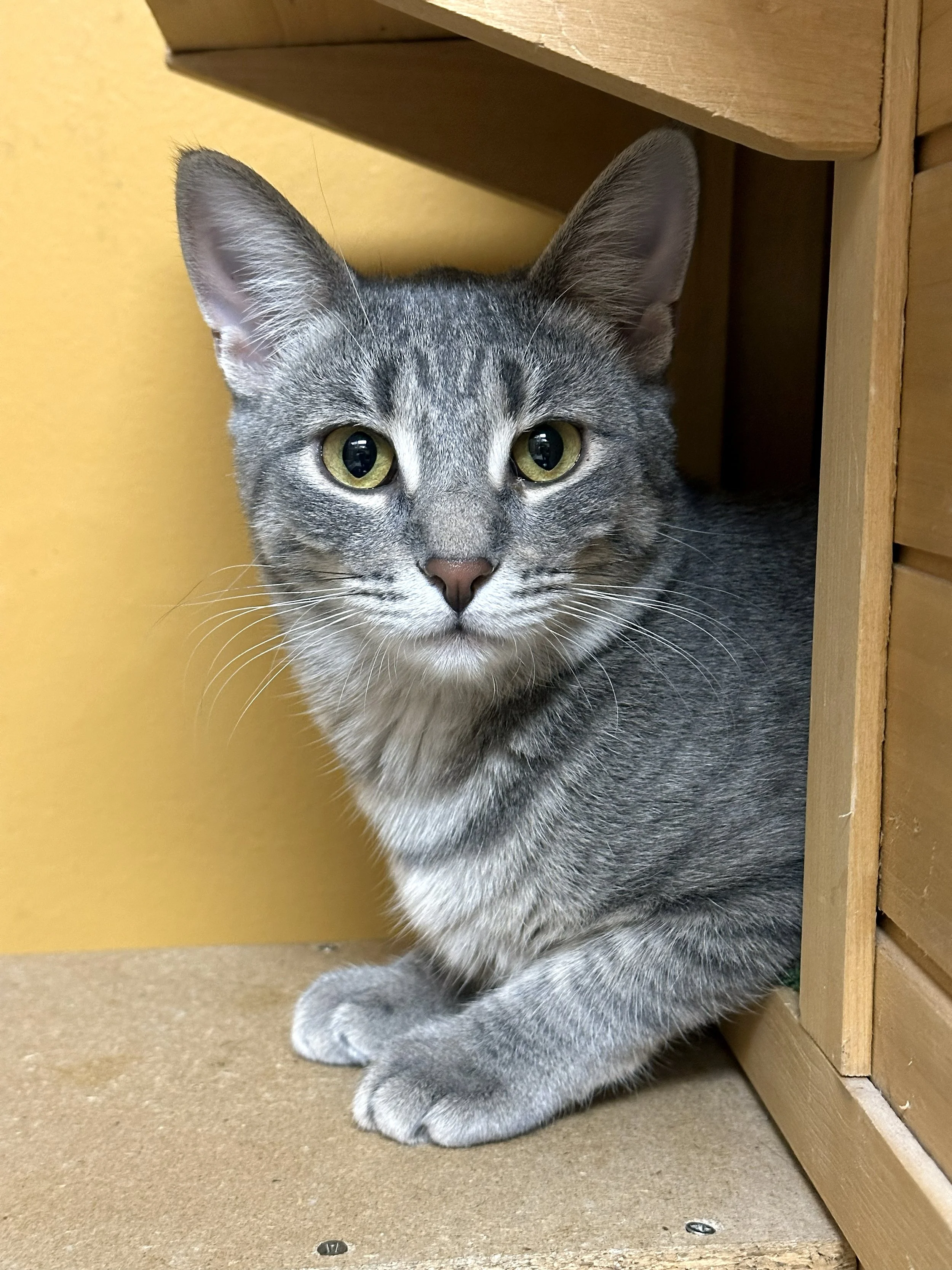 Hi! I'm Beverly! I am a sweet but (very) shy gray tabby girl. I enjoy pets, even if I don't quite know how to handle an affectionate hand. When I first came to the shelter with my friends, I was hissy and would cower from attention. (But, if you went slow I would take some pets!)