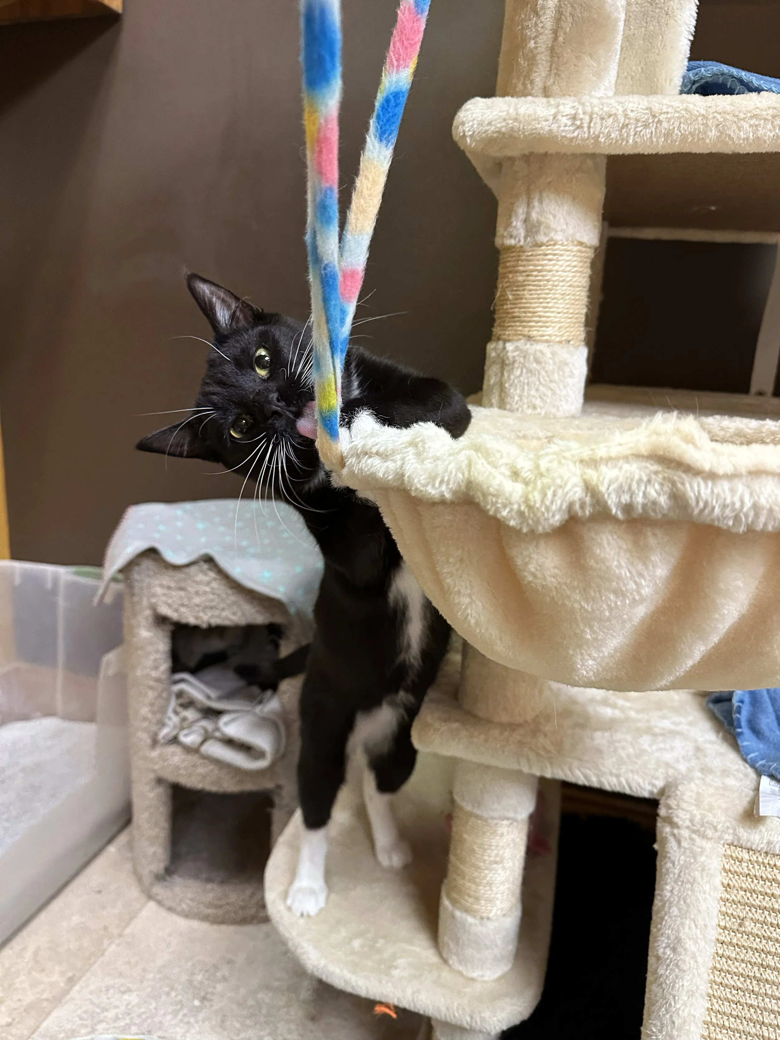 I need a patient home where I can adjust and keep learning to share what makes me special. I like climbing the shelves and stairs in our room—so a home with a tall cat tree would be wonderful!