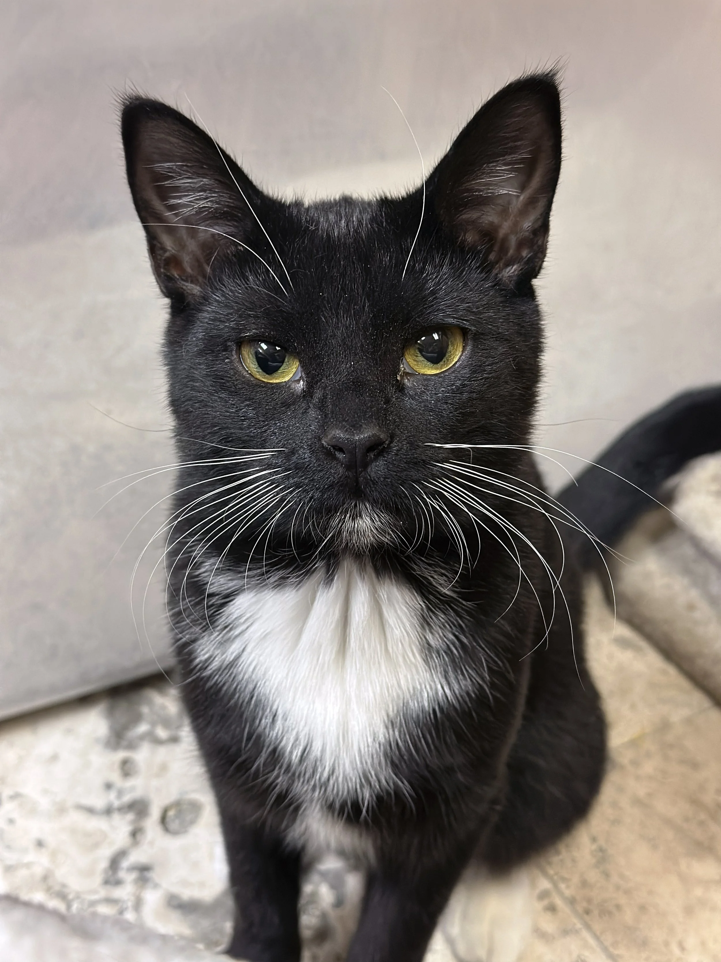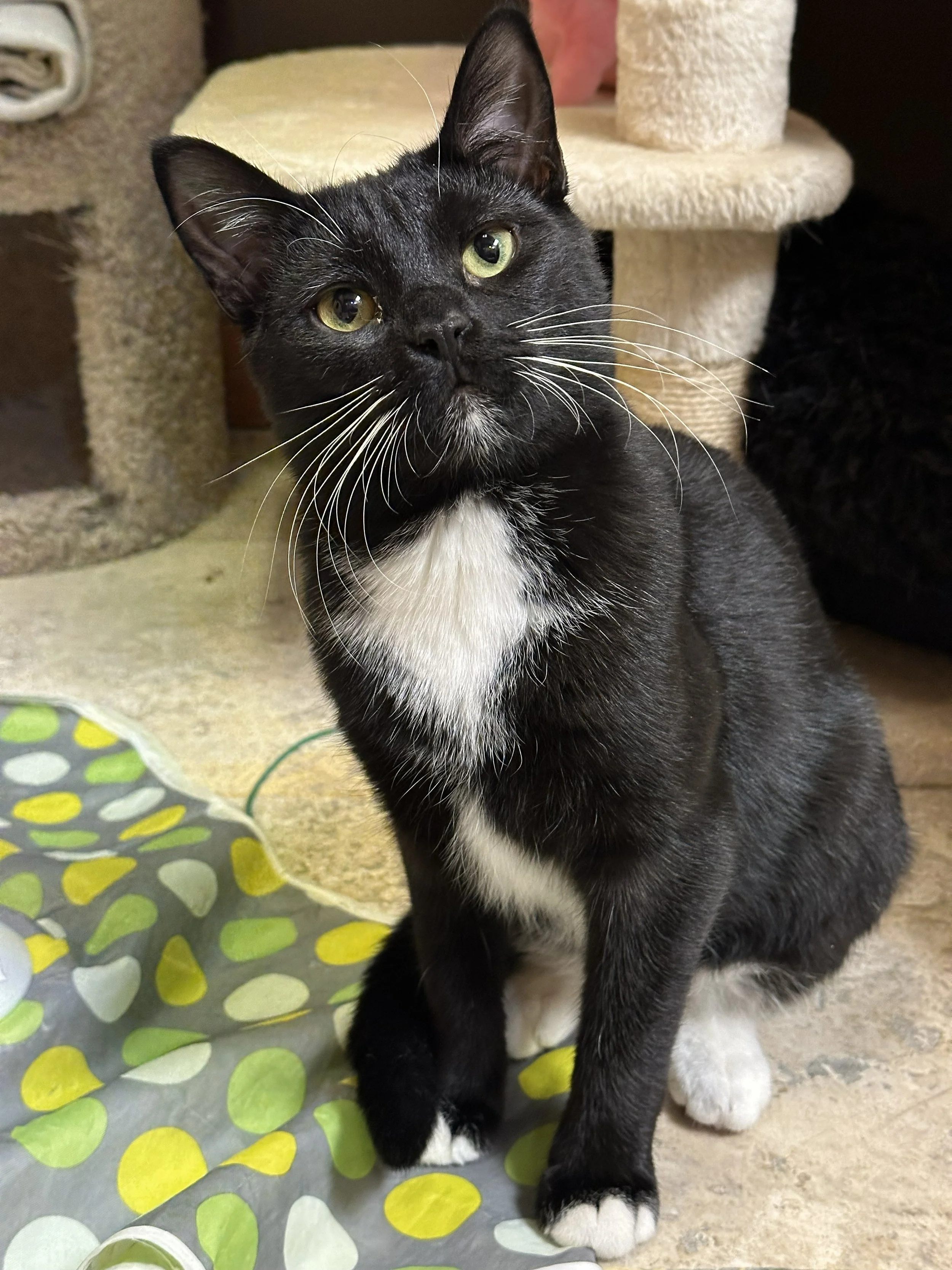 Hi! I'm Bernadette! I am an adorable black and white kitty with the whiskeriest whiskers that ever whiskered! I have whiskers for days! (I think my whiskers even have whiskers?) It's one of my most adorable features … along with my cute little white feet. And spunky purrsonality!