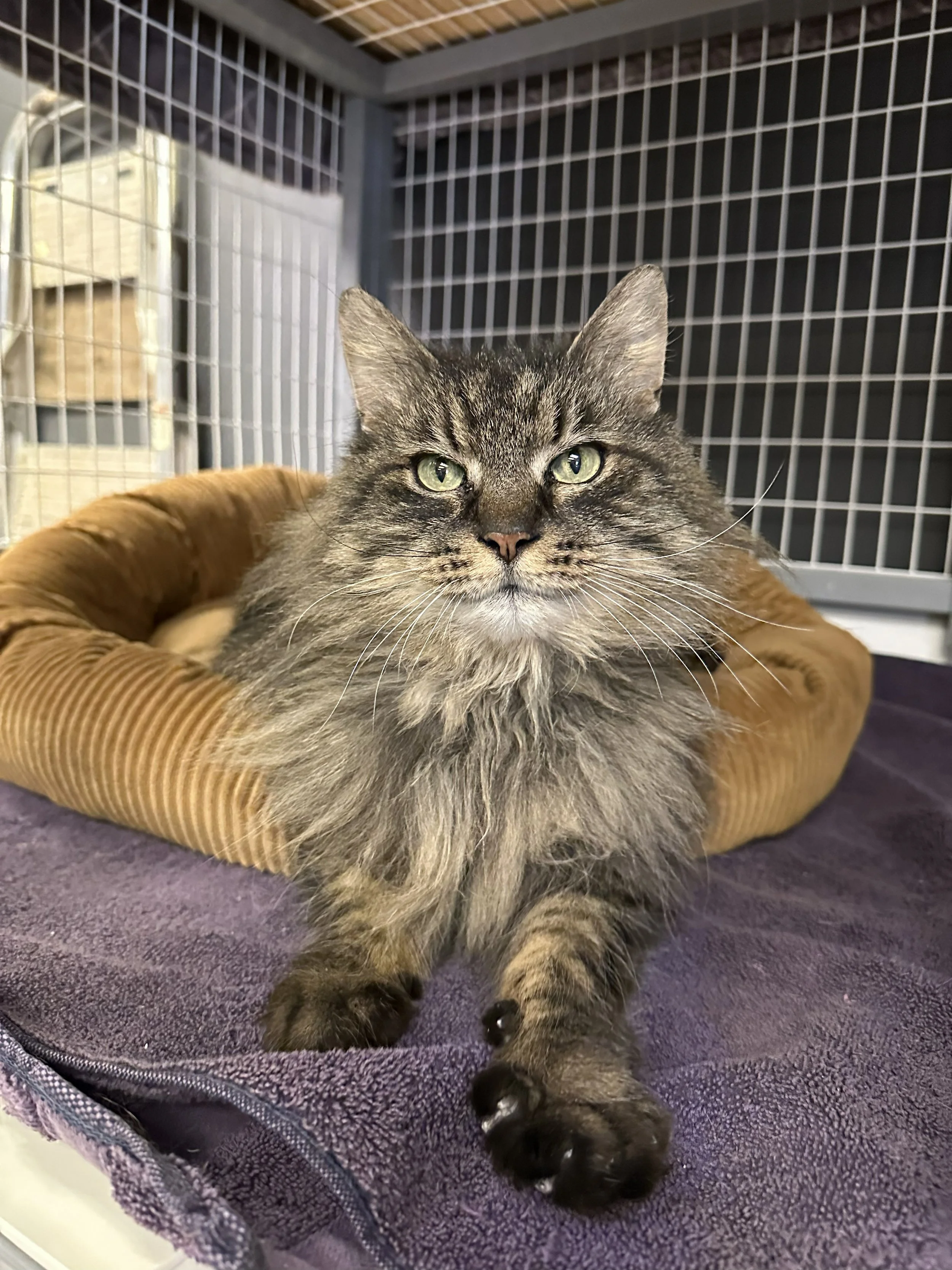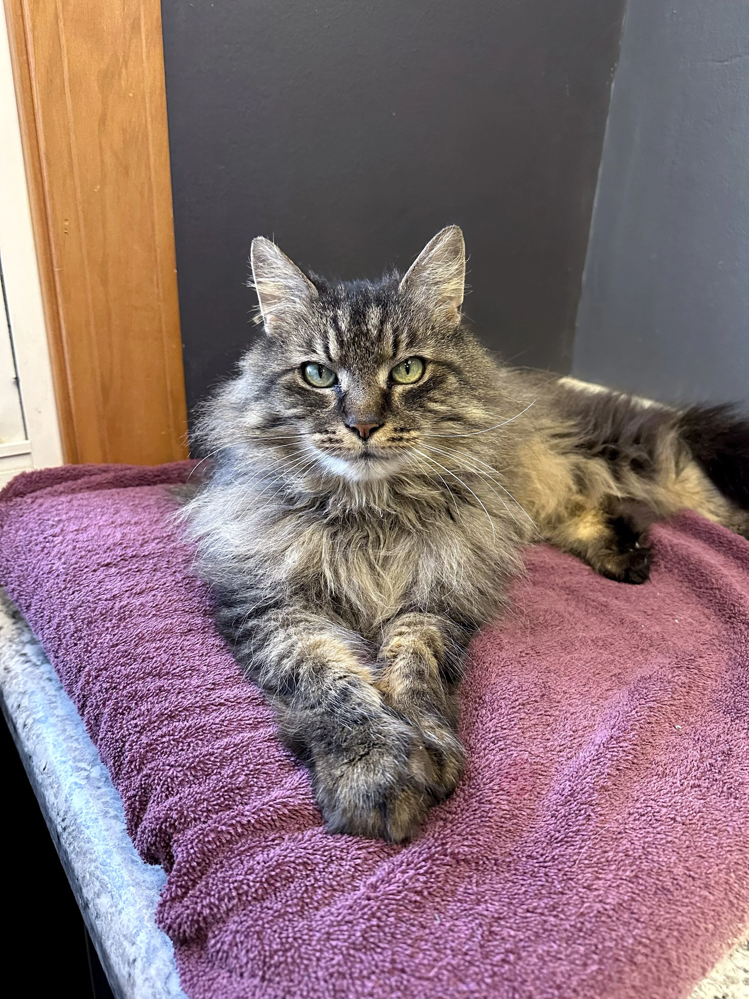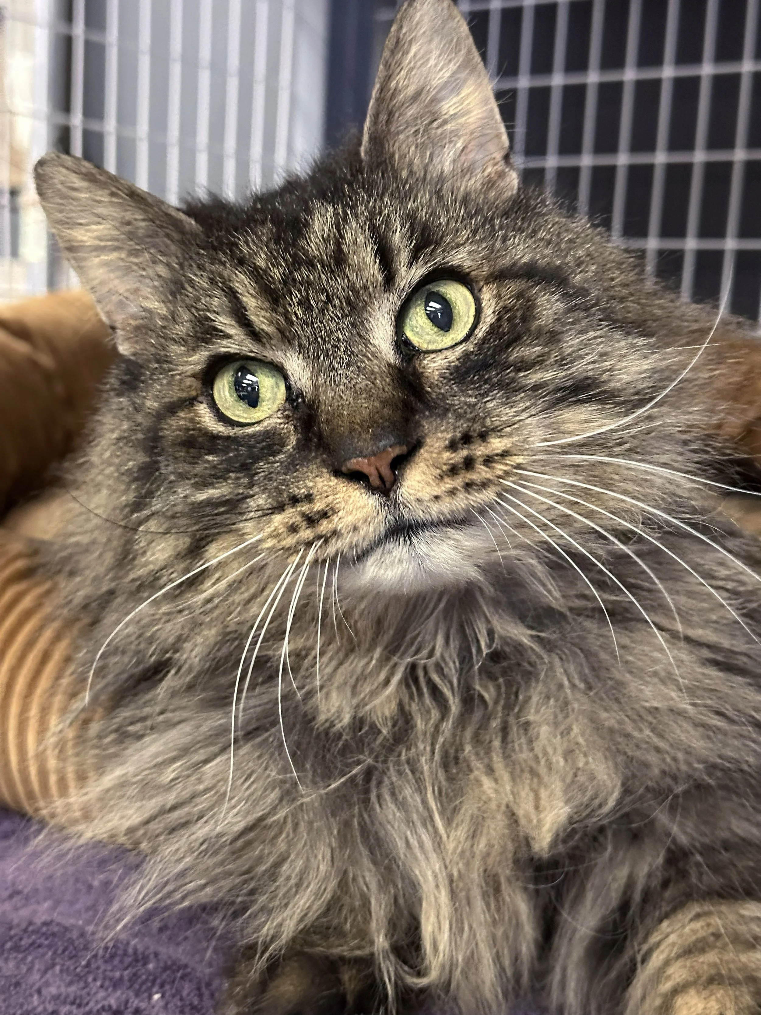 Hi! I'm Chessie! I am a stunning, long-haired girl (with equally stunning eyes). I have *the* most majestic neck floof. I am super sweet, playful, and very loving. I also love to make biscuits! I was found alone outside—months after a house fire—when my family never returned for me. (I wasn't spayed or microchipped—it's like I never belonged to anyone.)