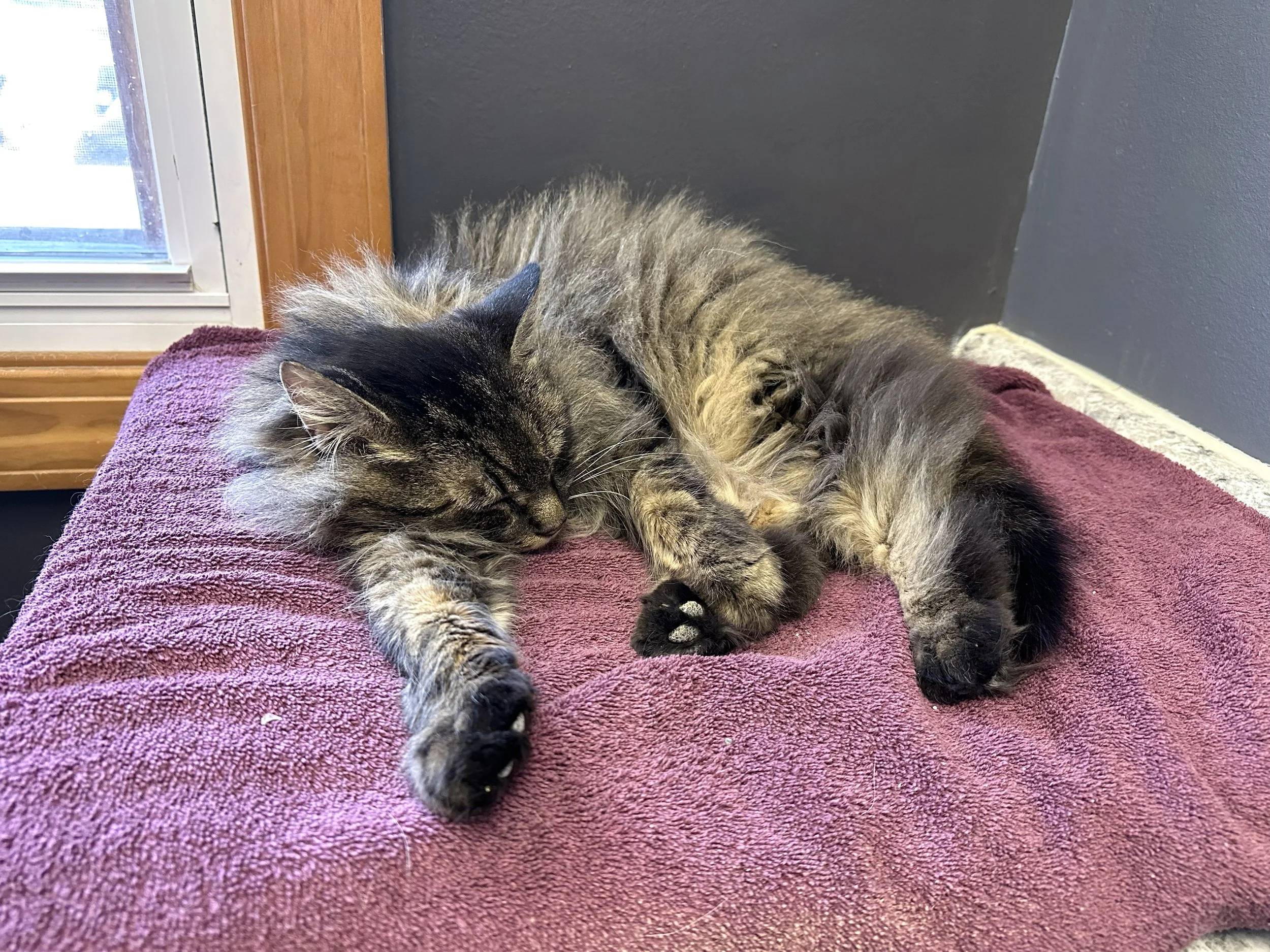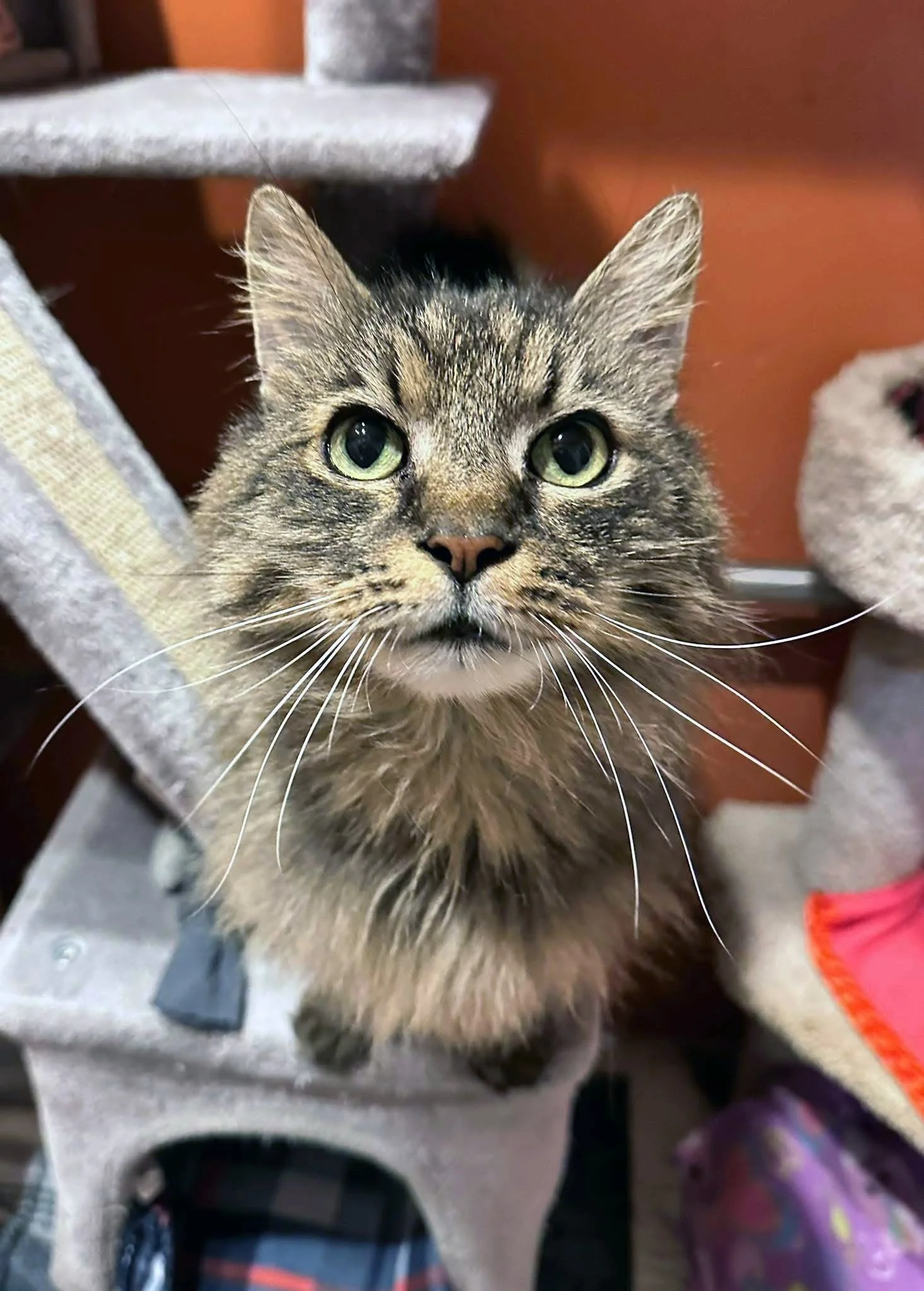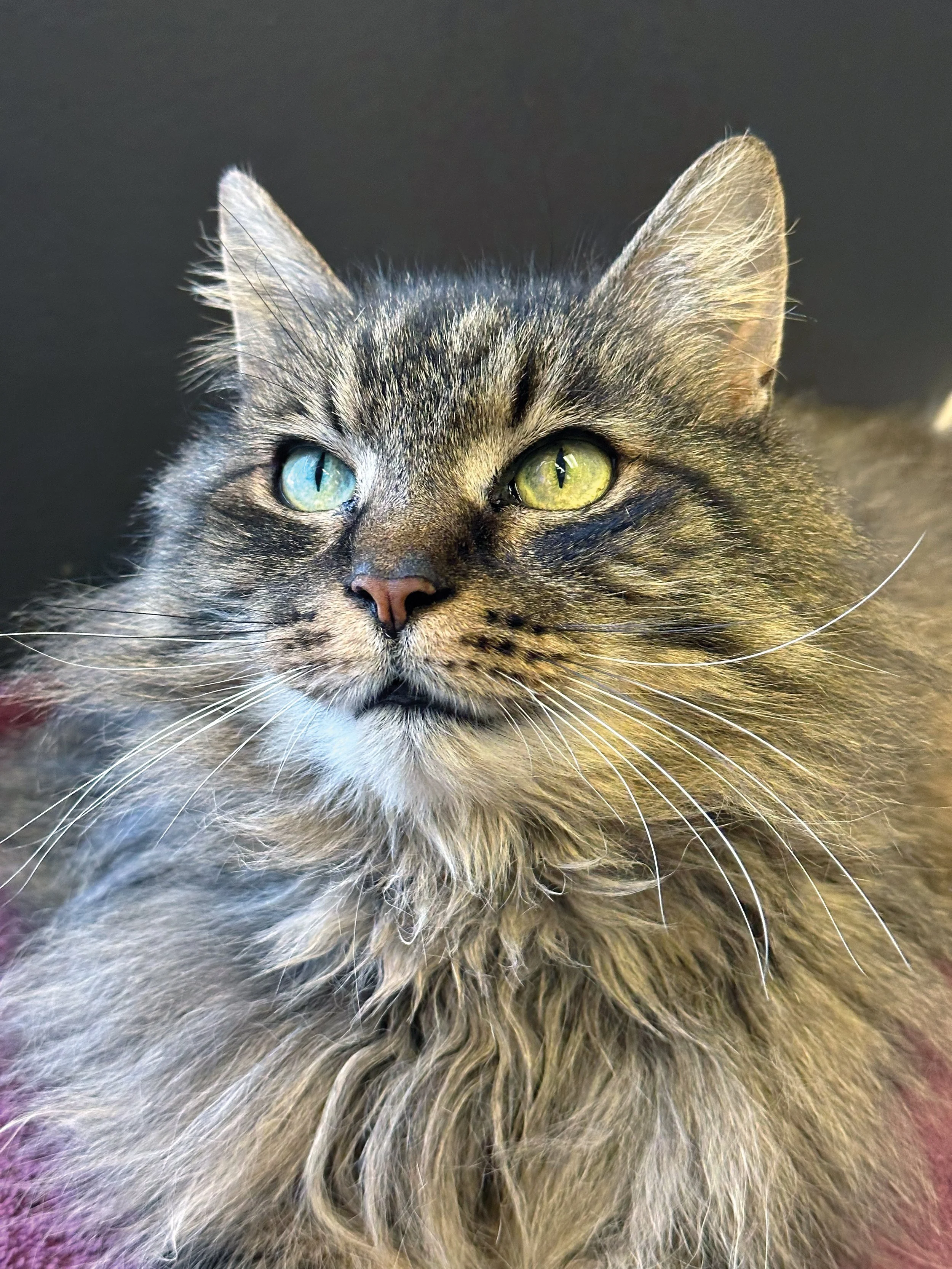 Hi! I'm Chessie! I am a stunning, long-haired girl (with equally stunning eyes). I have *the* most majestic neck floof. I am super sweet, playful, and very loving. I also love to make biscuits! I was found alone outside—months after a house fire—when my family never returned for me. (I wasn't spayed or microchipped—it's like I never belonged to anyone.)