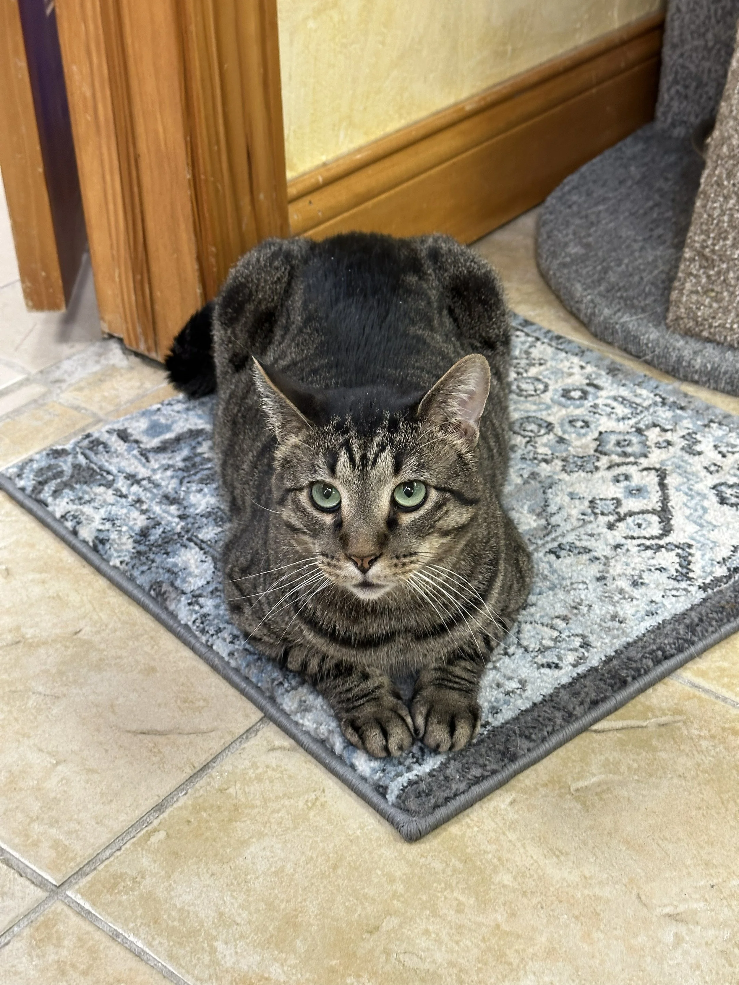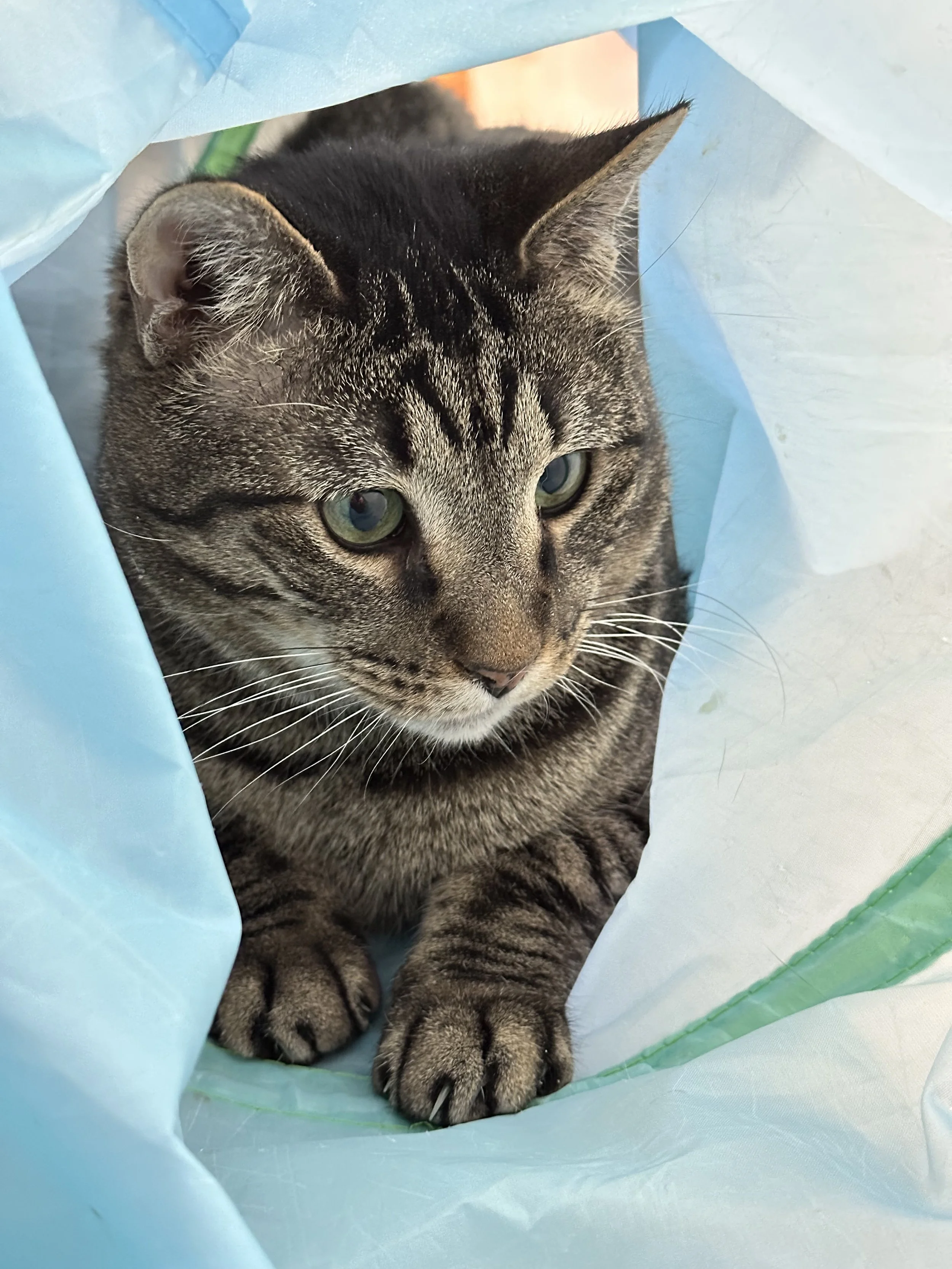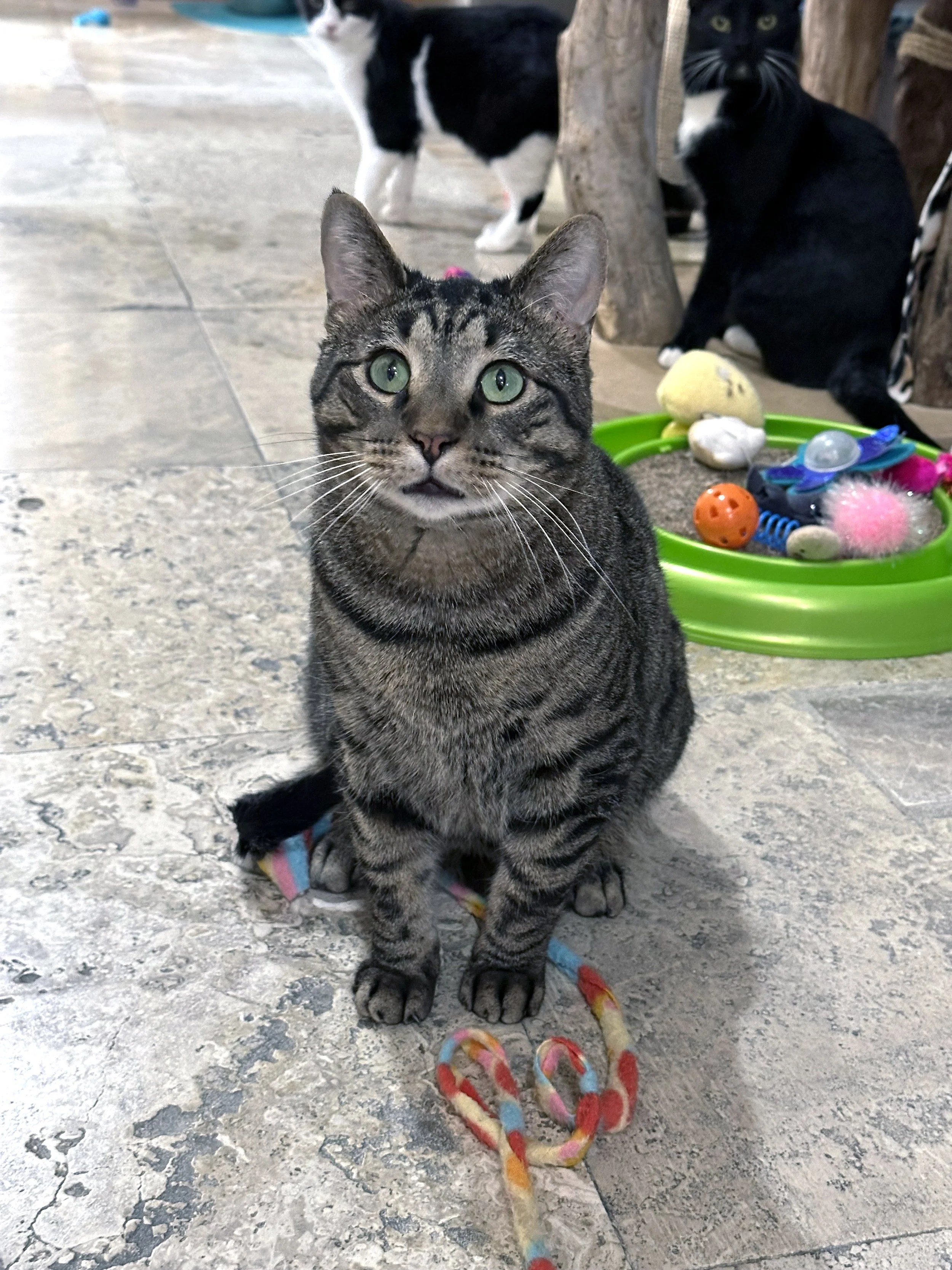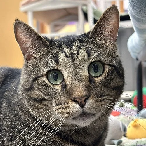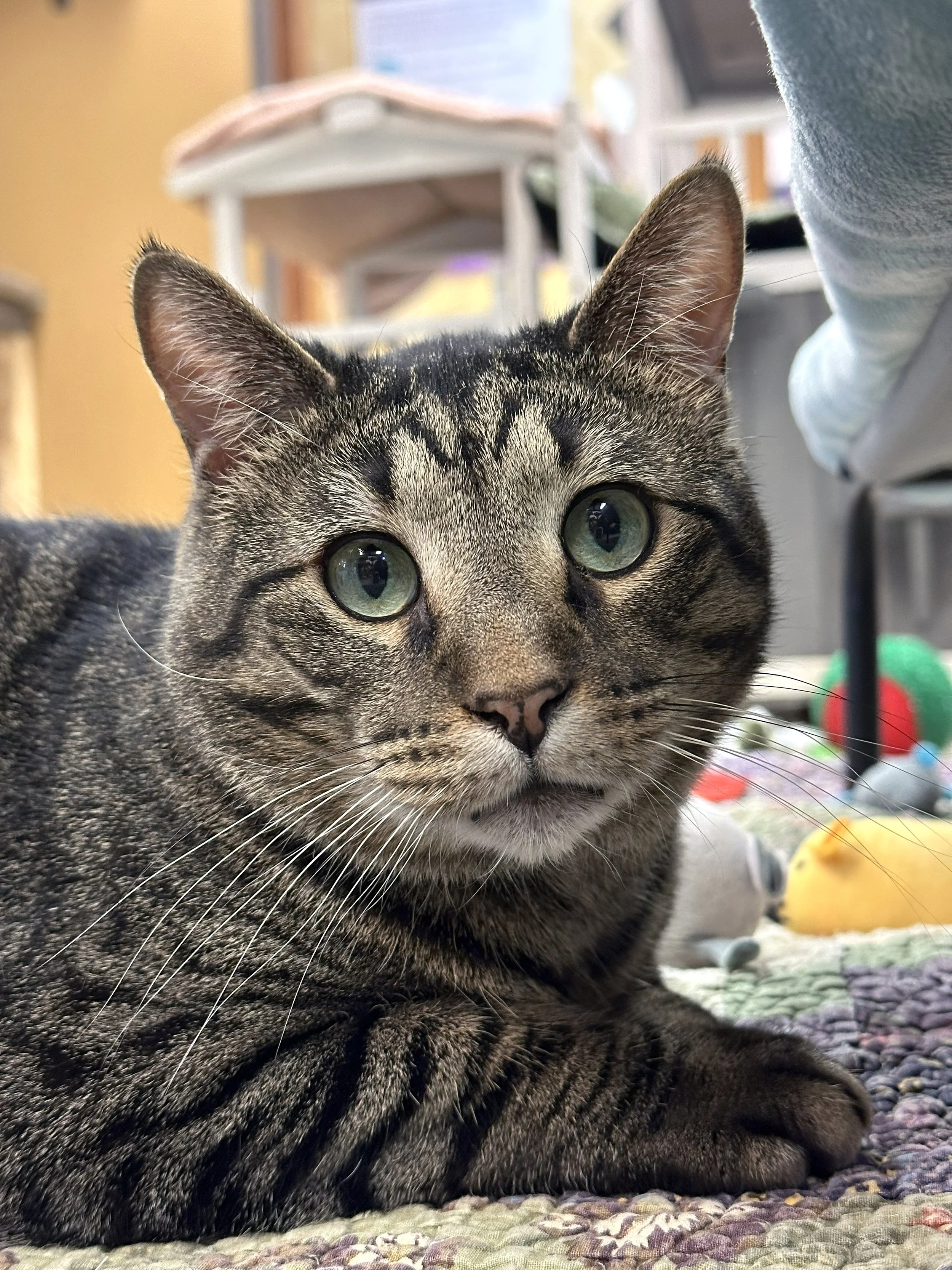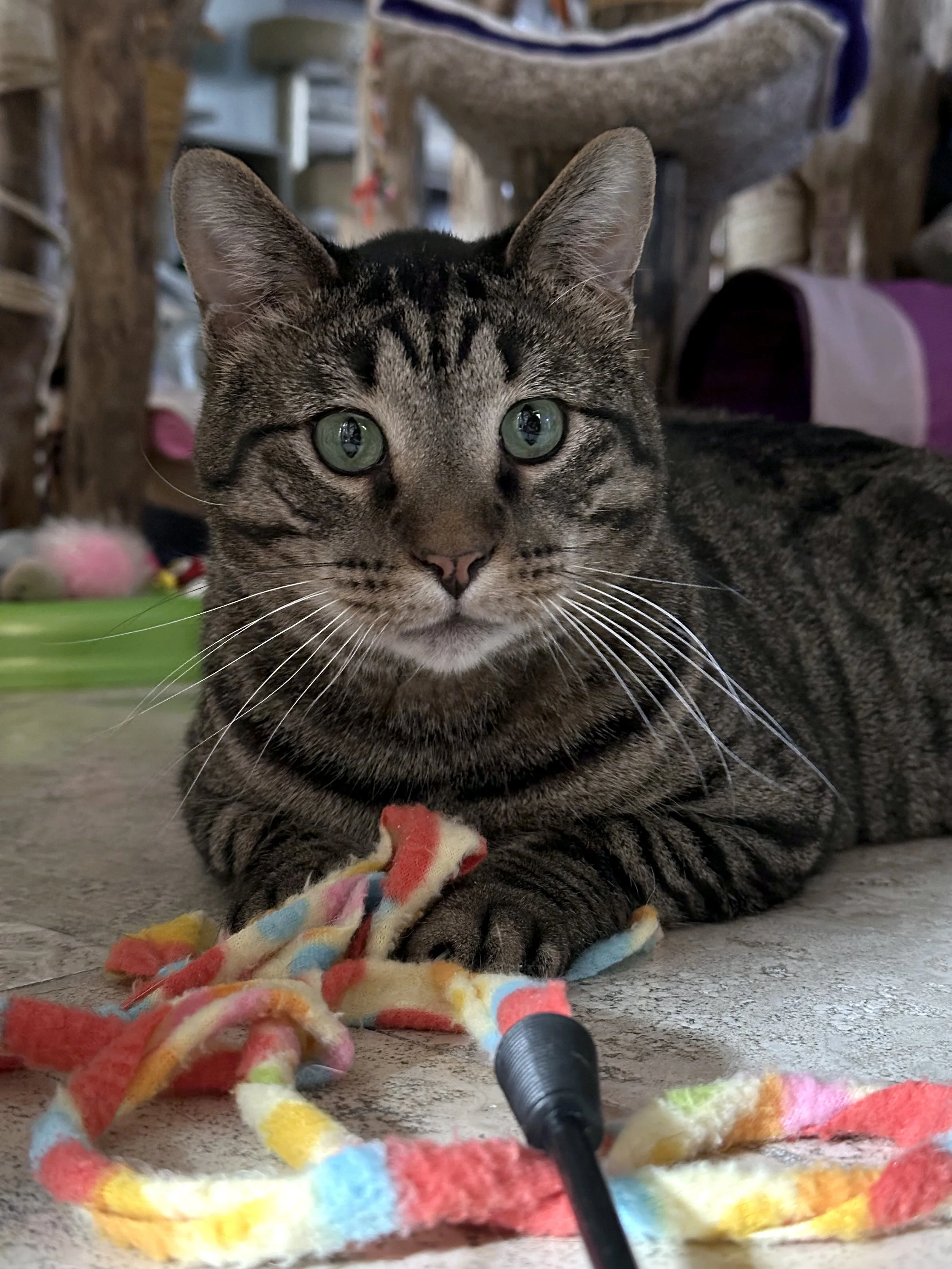 Hi! I'm Crybaby! I am a big, handsome brown tabby with large green eyes. I am pretty timid and like to keep hidden away, but I can be won over with a play session. (FYI: I like the feather toys!)