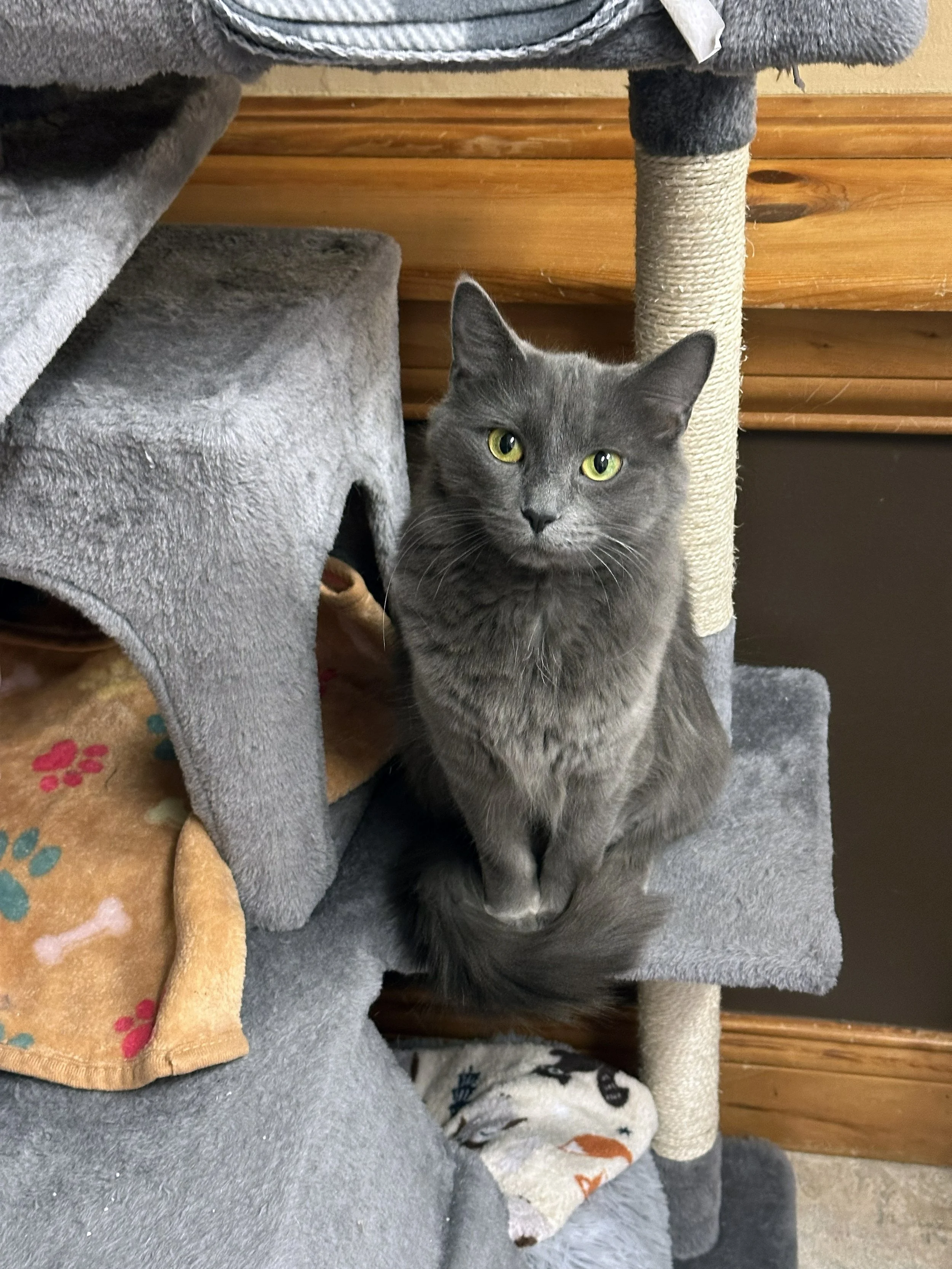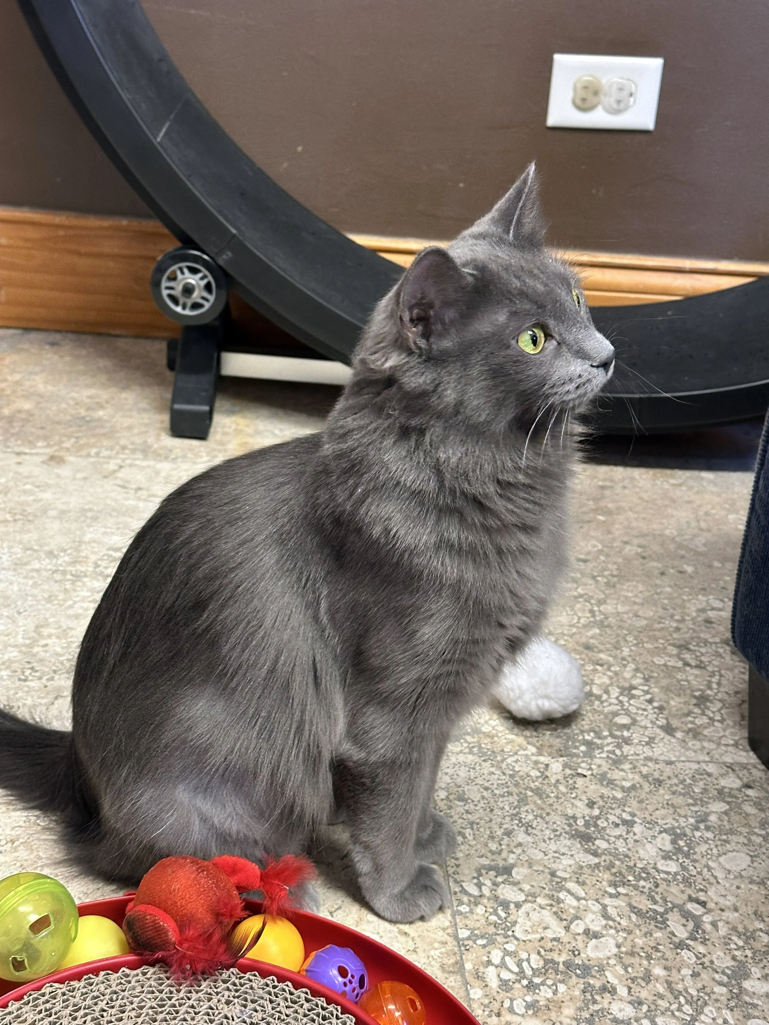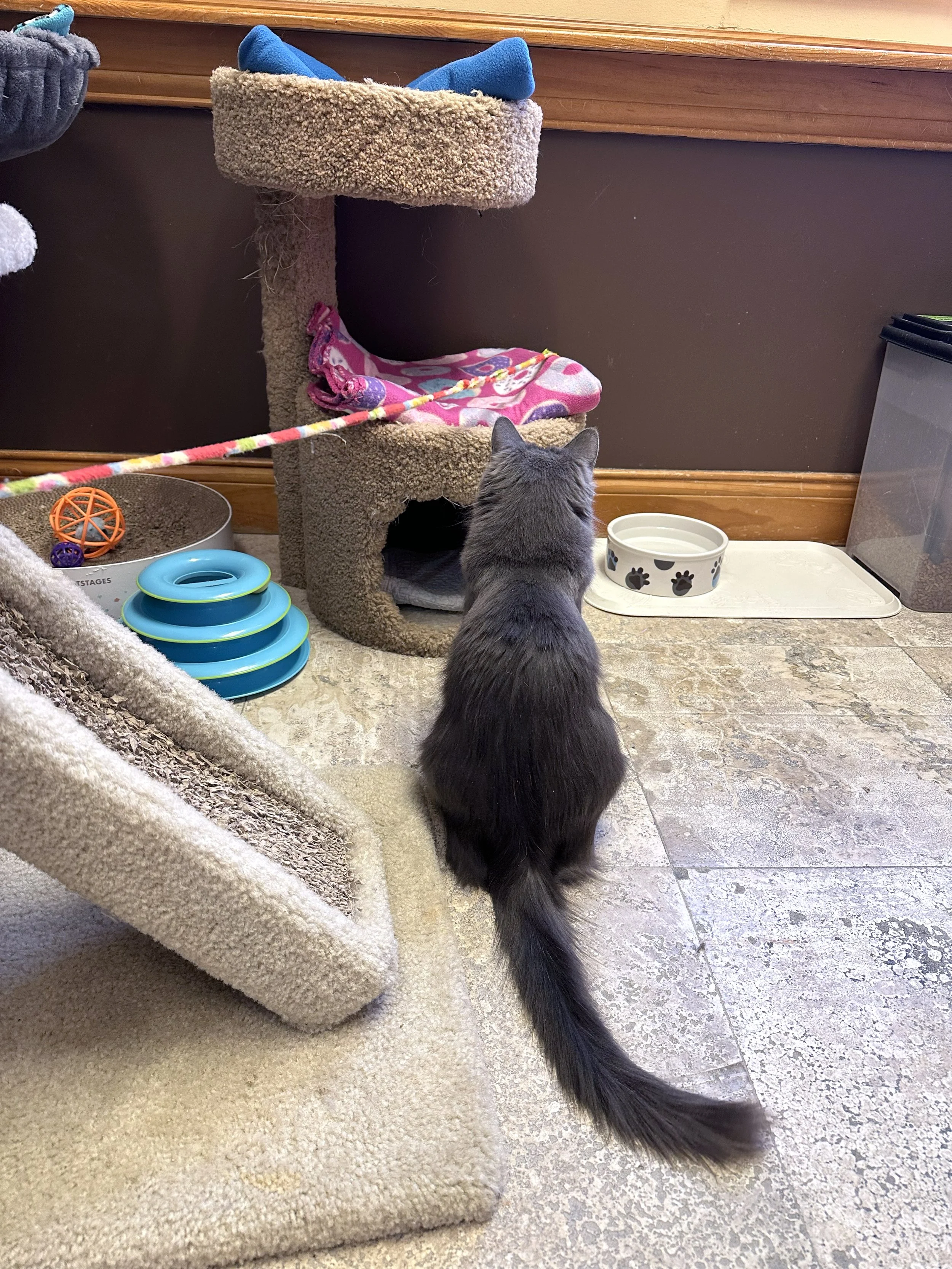 I love to chase wand toys, and am still figuring out those interactive electronic toys. My kittens and I all played and chased the wand toys together, but I do prefer time away from other cats. I'm looking for a home were I can be pampered and spoiled. I love to watch the birdies and sniff the fresh air, so a nice window watching spot would be purrfect!